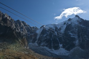 View from front window of cable car up toward the Aiguille du Midi.
