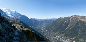 Panorama with Chamonix far below. Mont Blanc is in the background. For perspective, check out Curt on the trail to the far left.