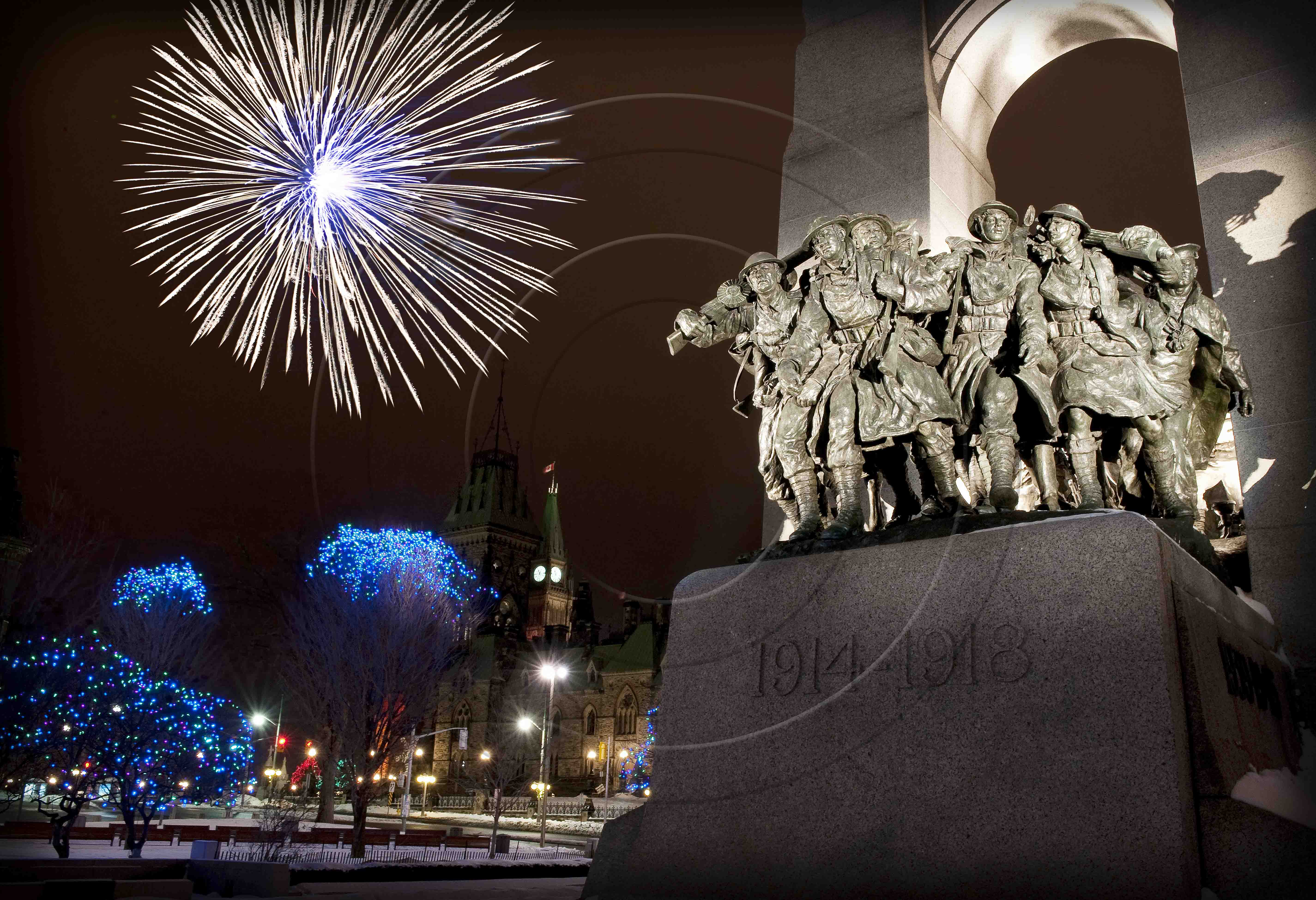 Canadian War Memorial at night with Parliament Buildings in the background.