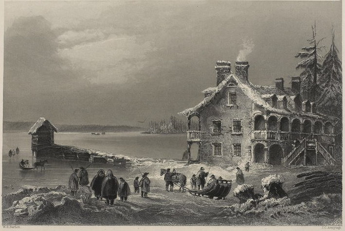Engraving by W.H. Bartlett, British watercolourist. Images from Bartlett’s Canadian tour were printed in “Canadian Scenery, 1842”. Publication of this work in the UK with its romanticized vision of Canadian scenes became a significant draw for the wave of British migration to Canada in the middle of the 19th century.